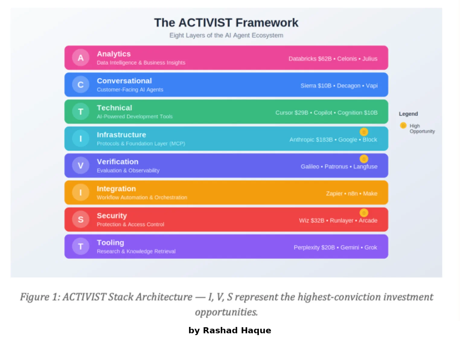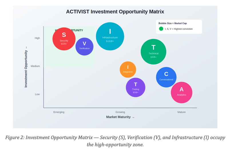 The ACTIVIST framework reveals distinct investment opportunities across layers. Security (S) and Infrastructure (I) represent the highest-conviction opportunities—addressing the most fundamental Agentic Economy challenges while commanding premium valuations.